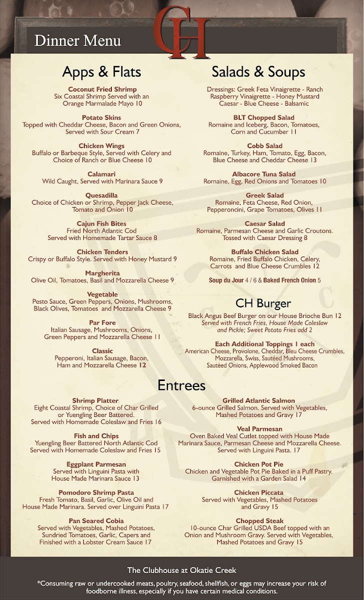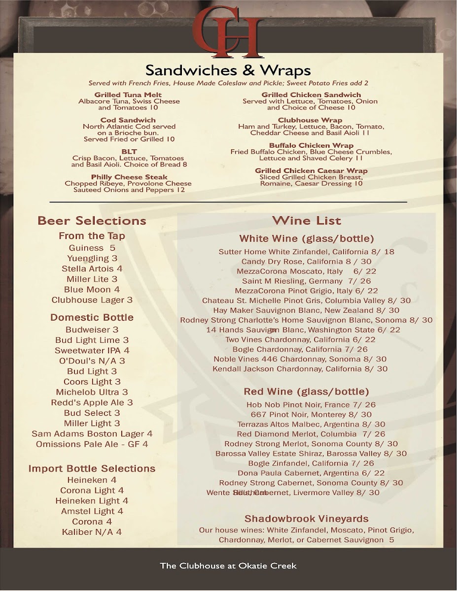 Welcome to The Clubhouse at Okatie Creek, a hidden gem located at 60 Sun City Club Ln, Bluffton, SC. This delightful eatery is quickly becoming a local favorite for its diverse menu and inviting atmosphere. The selections range from refreshing salads like the BLT Chopped Salad and Cobb Salad to hearty entrées such as Fish & Chips and mouthwatering burgers.